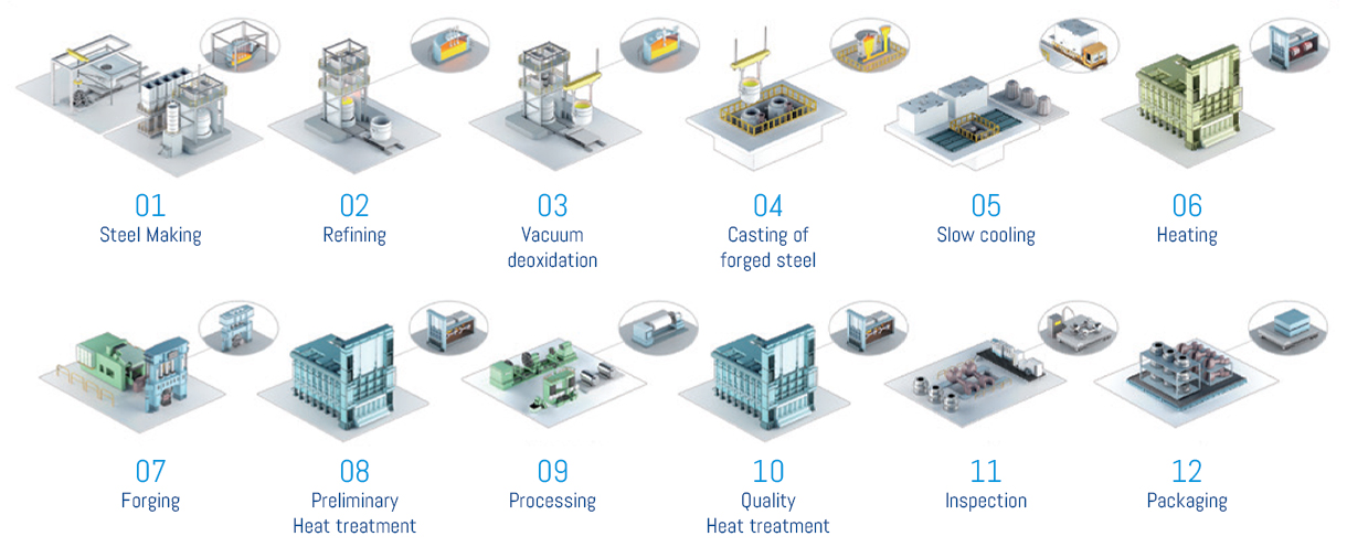 Iron scrap is melted to make molten iron, and impurities are removed through a refining process, and then ingots are made through an ingot process. After heating the forged steel again, forged products of various sizes and shapes are completed through forging and machining operations according to product specifications. Forged products include engine parts, stern materials, mold steel, forged rolls, and forged round bars used in ships, automobiles, and industrial machinery.